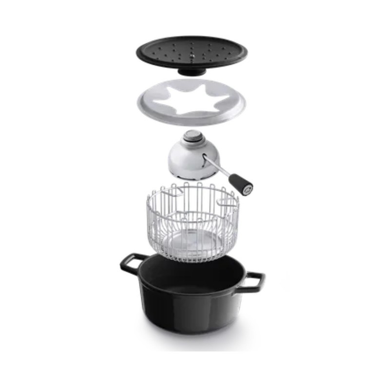 Ein weiterer Pluspunkt, gerade für Küchen mit wenig Stauraum: Rechaud, Sicherheitsgasbrenner, Spritzschutz und Deckel können kompakt im Fonduetopf gestapelt und verstaut werden.